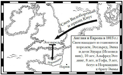 Когда Свен в 1013 г. самолично возглавил вторжение, население Денло продемонстрировало свои истинные пристрастия. Характерно, что оседлое датское население Англии авторы «Англосаксонской хроники» по-прежнему называли войском. Этельред, Эмма и их сыновья бежали к ее брату. Члены английской королевской семьи стали изгнанниками в Нормандии.