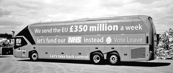 Автобус с рекламой Брексита и Национальной системы здравоохранения: «Каждую неделю мы платим Евросоюзу 350 миллионов фунтов. Давайте лучше потратим эти деньги на здравоохранение. Голосуйте против ЕС. Вернем власть в свои руки». Фотография автора