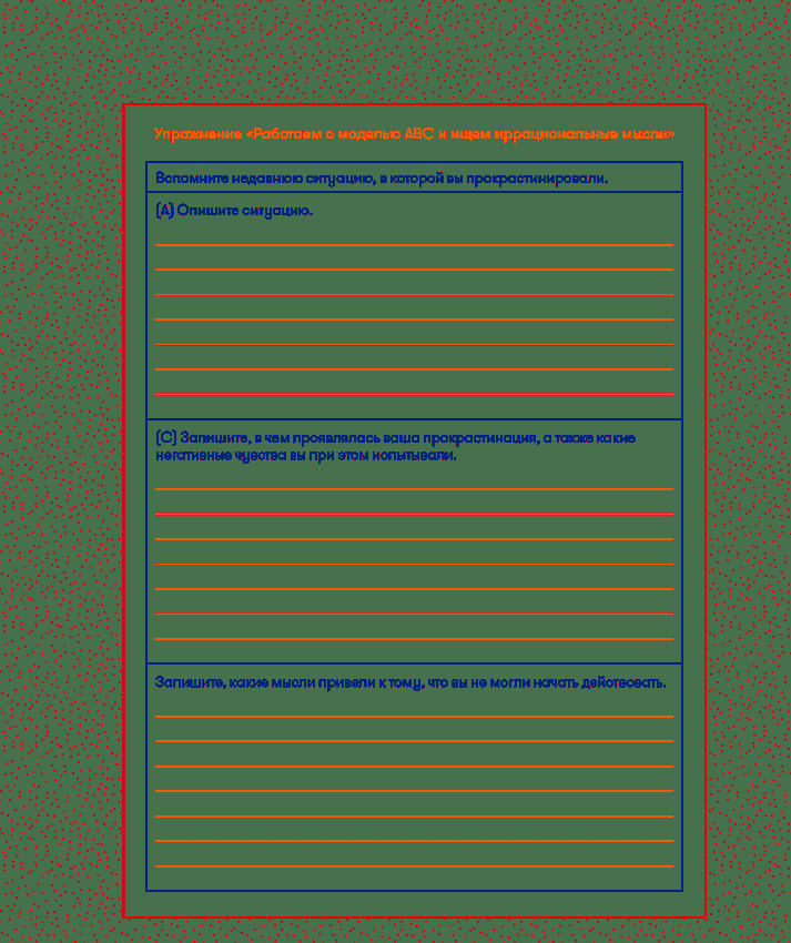 Проверяем иррациональные мысли на прочность: портим себе удовольствиеА что теперь? Теперь надо работать. Негативное мышление это почти всегда привычка, а привычки вещь упрямая, того и гляди, опять попадешь к ним в ловушку. Как только вы осознаете некоторые из своих иррациональных мыслей, постарайтесь испортить для себя «удовольствие» от их привычного течения. Вам нужно перестать видеть в таких мыслях приятное и притягательное, чтобы автоматически включился поиск более продуктивных и рациональных идей. В РЭПТ это называется проверкой на прочность. Это и есть шаг D, к которому можно переходить после того, как вы проработали пункты А, В и С.