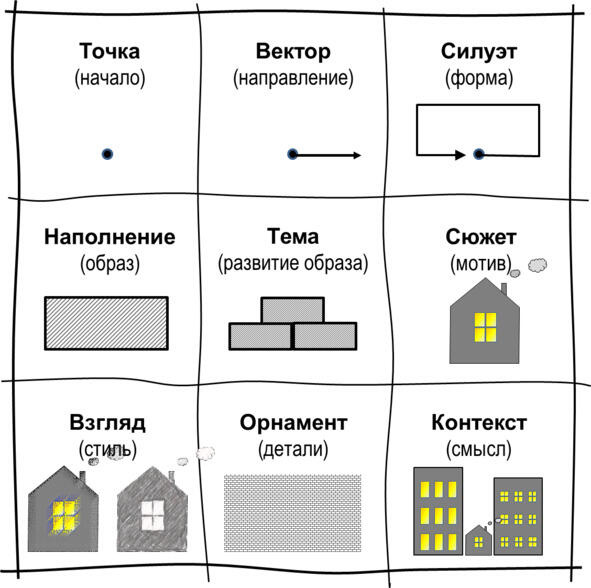 Конечное появление мысли начинается из точки, далее, делая какие-то выводы и приходя к заключению, мысль развивается в одномерную линию. Затем, понимая, что мы находимся в определенном окружении, мы очерчиваем границы ситуации, рисуем карту, намечаем цели, мысль находится в двухмерном измерении. Сталкиваясь с проблемами, которые невозможно обойти, и решая их, мы находим объем, а сталкиваясь с изменениями ситуации на карте ситуации мы добавляем к нашему мышлению новые и новые измерения, сами того не замечая.