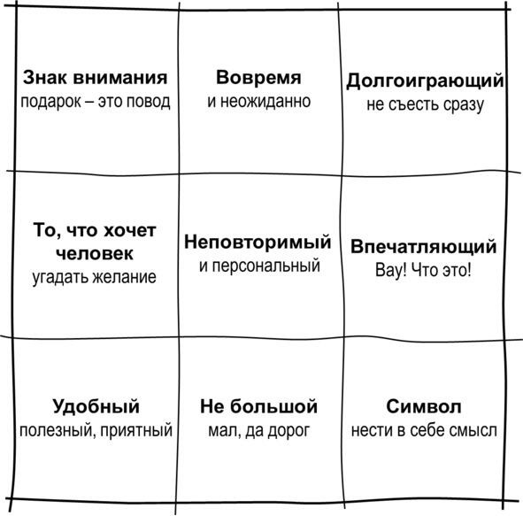 Но если вы хотите сделать настоящий подарок, который скрепит ваши отношения, вы можете воспользоваться «матрицей подарков». Этот подход позволит вам проверить рекомендации или собственную фантазию и «доработать» подарок. Собрав свои основные варианты в матрице, помните, что вы можете дополнить ее своими собственными наблюдениями и добавить к характеристикам подарка свои собственные требования и предпочтения.