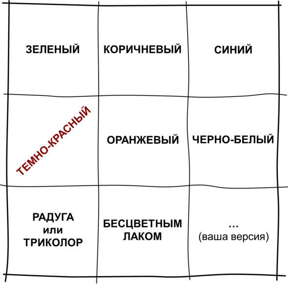 Можно опустить мотивы или причины выбора той или иной краски, так как они затрагивают интересы нескольких людей и помешали бы чистоте эксперимента демонстрации приема генерирования идей, дожимание идей до девяти, но представьте, что вы решаете, что в этот раз сгенерируете все девять альтернатив. Итак, ЗЕЛЕНЫЙ, самый подходящий, КОРИЧНЕВЫЙ, тоже нормально для забора, СИНИЙ говорят, успокаивает, БУРЫЙ, ну так, чтобы как красный, но темный, ОРАНЖЕВЫЙ особенно хорошо будет смотреться на солнце. ЧЕРНО-БЕЛЫЙ и вот здесь есть небольшой разрыв в линейной логике, добавился еще один цвет, продолжая эту линию, можно было прийти к идее РАДУГИ или ТРИКОЛЛОРА. Дальше БЕЖЕВЫЙ, возврат в привычную линейную логику и снова прорыв: ЗАЧИСТИТЬ И ПРОКРЫТЬ ЛАКОМ! Фактура и текстура, вместо цвета! Здесь уже видно прорыв в другое измерение! Вместо цвета появляется еще и форма поверхности и естественный цвет и структура дерева. Так, простое генерирование идей иногда приводит к прорывным идеям, и задача матричного мышления как раз развить способность мыслить и оперировать идеями приходить к новому качеству.