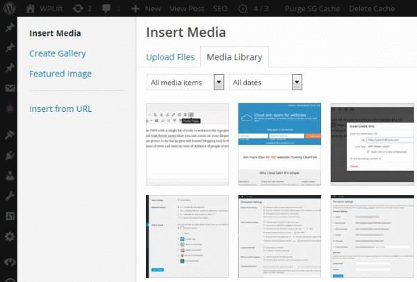 Важная часть любой записи блога изображения. Все изображения, видеофайлы и аудиофайлы в WordPress находятся под контролем медиа-библиотеки. При написании записи вы можете обратиться к медиа-библиотеке, просто загрузив изображение или выбрав любое из уже загруженных ранее. На экране редактирования записи щелкните по кнопке Add Media, расположенной над главным полем визуального редактора. Появится окно, в котором будут выведены изображения, уже используемые на сайте: