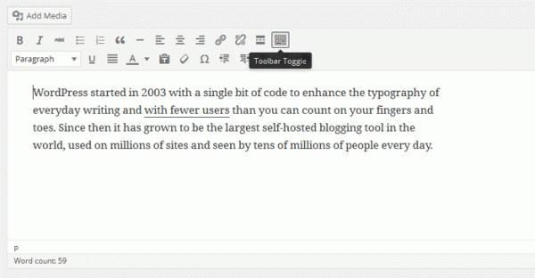 По умолчанию вы имеете в своем распоряжении лишь некоторые ограниченные опции форматирования, доступные в визуальном редакторе. Если вы щелкнете по кнопке «Toolbar Toggle», появится еще одна строка с разными опциями, где будут находиться дополнительные элементы форматирования, которые вы можете использовать при наборе текста вашей записи.