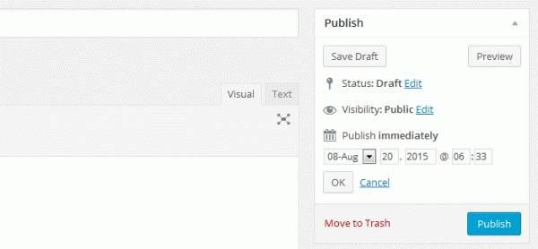 Как только вы закончите с данными опциями, перейдите в самый верх страницы там по правому краю вы увидите поле «Publish». Чтобы сразу же опубликовать запись на сайте, просто щелкните по кнопке «Publish». Запись тут же появится на сайте. Перед тем как сделать это, давайте познакомимся поближе с еще одним прекрасным механизмом WordPress, который называется планированием публикаций. Щелкните по кнопке Edit рядом с текстом «Publish immediately», и вы увидите календарь, где вы можете установить нужную дату и время публикации записи. Если вы зададите дату публикации и щелкнете Ok, кнопка Publish будет заменена на Shedule, щелчок по которой приведет к планированию вашей записи. Это очень удобная возможность, если вы добавляете массу записей и хотите, чтобы они равномерно публиковались на сайте.