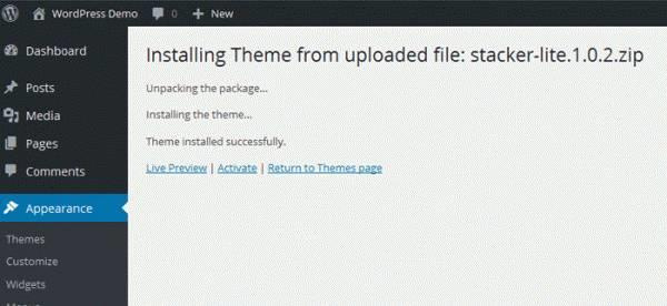 После того как тема будет загружена, вы можете либо щелкнуть по ссылке «Live Preview», чтобы посмотреть, как тема будет выглядеть на вашем сайте, либо вы можете кликнуть по ссылке «Activate», которая сделает вашу тему активной на вашем сайте.