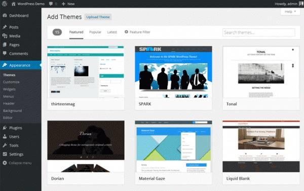 Чтобы добавить темы из каталога, вам не обязательно даже посещать официальный сайт WordPress. Вы можете установить темы через консоль WordPress. Посетите раздел «Appearance» «Themes» «Add New», и вы увидите список тем. Здесь вы можете выбрать самые свежие темы, популярные темы, а также просто интересные темы (которые меняются случайным образом каждый день). Также имеется фильтр, который позволяет вам выбирать темы по цветовой гамме, возможностям и опциям макета. Вы можете выполнять поиск по ключевым словам, которые будут описывать необходимый вам тип темы.