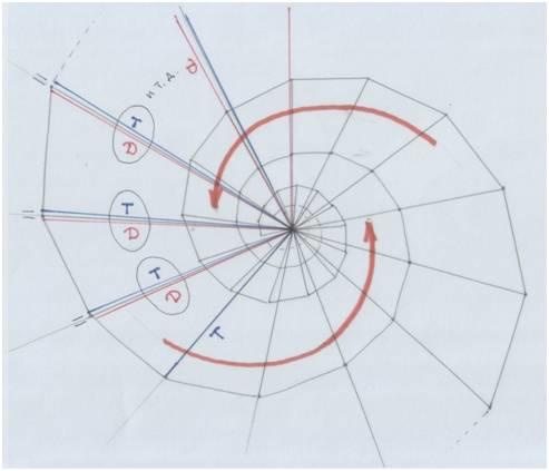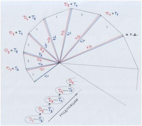 История эта геометрически воспроизводит историю с доминантой и тоникой. В роли тоники горизонталь треугольника. Гипотенуза в роли доминанты. Эта «доминанта» становится «тоникой» (горизонталью) нового треугольника. В нём образуется новая «доминанта»/гипотенуза, которая становится новой «тоникой» и т.д.