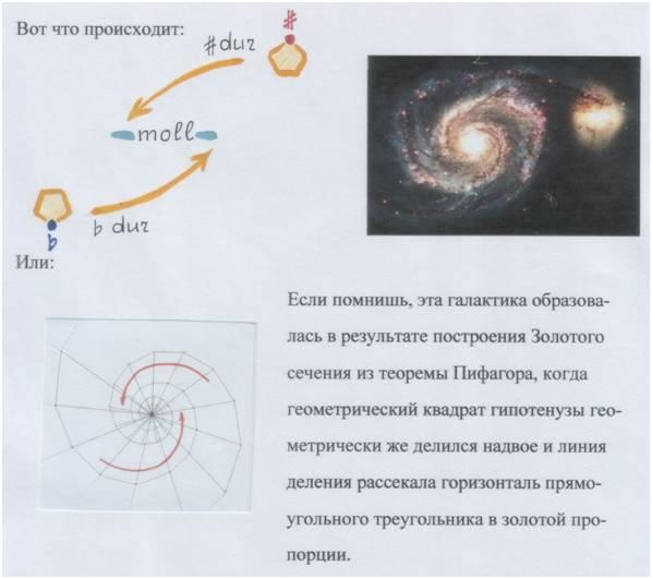 В рисунке галактики ты видишь м о д у л я ц и и (изменения) треугольника. Они возможны благодаря Золотому сечению. Благодаря с а м о п о д о б и ю: все они п о д о б н ы друг другу. Это как будто один и тот же треугольник («сам») то увеличивается, то уменьшается, то возрастает, то убывает изменяется (он вроде тот же, да не тот). Изменяется с одним и тем же коэффициентом пропорциональности.