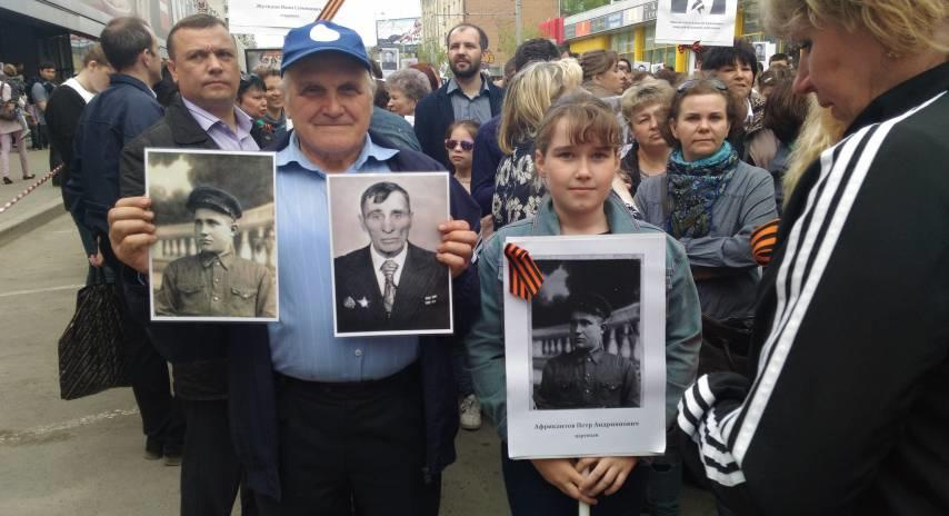 Бессмертный полк. В первом ряду, слева направо, сын пограничника и партизана П.П. Африкантов, правнучка А.В.Козырева, и боком, справа, стоит внучка О.Н. Козырева. В руках у Петра Петровича две фотографии своего отца и тестя И.В. Ковалёва. Саратов 2018 год.