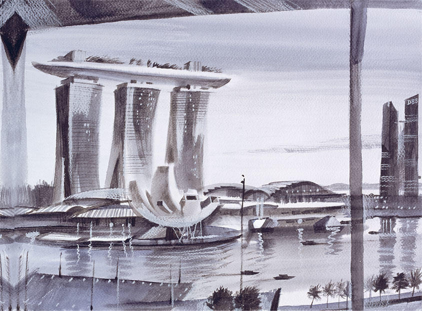 Комплекс гостиницы Marina Bay Sands, Сингапур, 2013. Акварель, белила, бумага