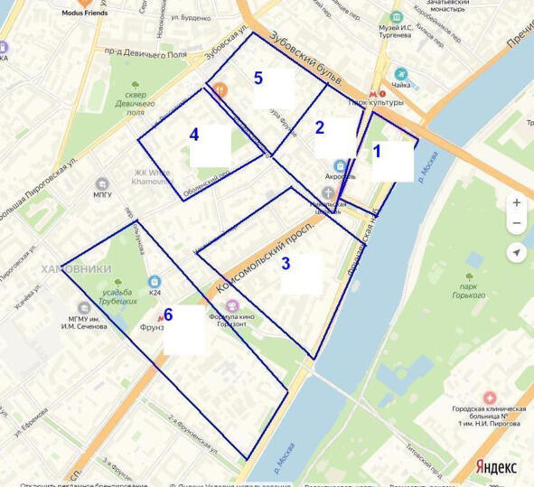 Схематичный план местности в XVII веке: 1 Чудова слобода; 2 Хамовная слобода; 3 владения Лопухина; 4 владения стольника Венедикта Хитрово; 5 владения Долгоруких; 6 владения бояр Голицыных