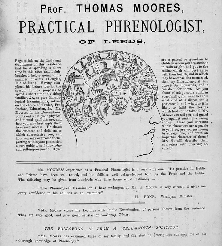 Ил. 0.4. Рекламная листовка профессора Томаса Мура, френолога из Лидса. Ок. 1870. Профессор Мур уверяет, что его анализ формы головы открывает внутренний характер человека, а диаграмма иллюстрирует различные способности, которые можно открыть, исследовав выпуклости черепа. Среди прочих названы воинственность, супружеская любовь, склонность к поиску пищи (алиментативность) и надежда