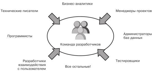 Гибкая команда разработчиков это группа многофункциональных специалистов, которые могут работать с любой функцией, которую желает получить клиент, и превратить ее в готовый, рабочий программный компонент. В состав команды входят аналитики, разработчики, тестировщики, администраторы баз данных и все остальные специалисты, которые нужны для превращения пользовательских историй в программу, готовую для реального использования.