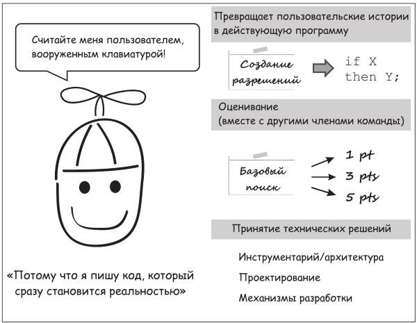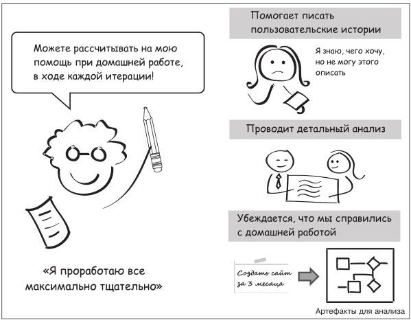 Аналитик выполняет в гибком проекте множество задач: помогает клиенту писать пользовательские истории (см. главу 6); выполняет глубокий анализ, когда дело доходит до разработки; помогает создавать имитационные объекты (mock-ups) и прототипы; использует в ходе анализа все доступные ему инструменты, чтобы донести до разработчика сущность пользовательских историй.