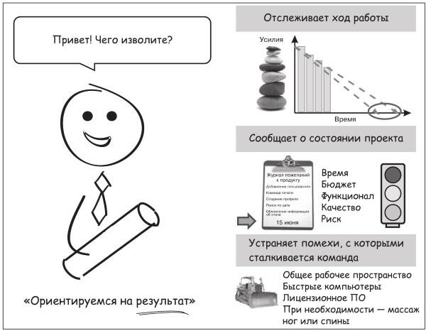 Кроме того, к его задачам относится улавливание ожиданий всех людей, занятых в работе над проектом: передача отчетов о состоянии дел владельцам (stakeholders), стимулирование взаимодействий внутри компании, а также защита рабочей группы от неблагоприятных внешних воздействий. Все это обязанности хорошего гибкого менеджера проектов.