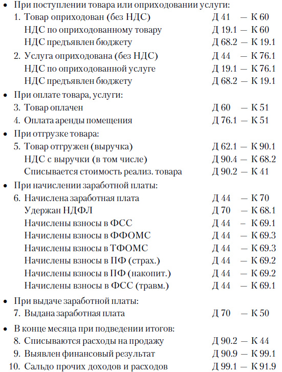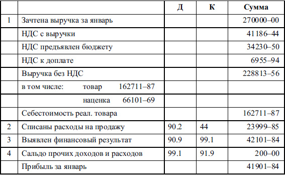 В конце каждого месяца нам предстоит подвести итоги, т. е. рассчитать выручку, выделить с нее НДС, списать затраты на себестоимость и определить прибыль. Затраты до момента их списания на себестоимость будем формировать на счетах 44 «Расходы на продажу» (торговля) или 20 «Основное производство» (производство, услуги), а в конце месяца списывать их на счет 90.2 «Себестоимость продаж».