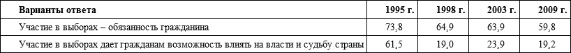 Общественное мнение испытывает разочарование в политике и, хотя еще сохраняет приверженность к демократии, негативно относится к политической жизни. В целом политика рассматривается как затхлая коррумпированная область господства элиты, от которой общество не видит ничего хорошего. Основная форма участия граждан в политике выборы, и их отношение к участию в них как к гражданской обязанности подчеркивает отсутствие уверенности в том, что можно реально влиять на происходящие события. Это подтверждается результатами исследования, проведенного в 2009 г. Социологическим центром РАГС, на тему «Социально-политические ценности в массовом сознании российского общества».