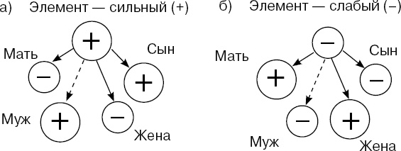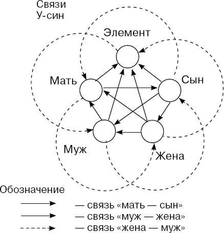 Теперь рассмотрим схему У-син в приложении к одному из элементов. Для удобства рассмотрим элемент «огонь», обозначив его так: «элемент». Все остальные элементы обозначим в полном соответствии связям в схеме У-син: «мать сын», «муж жена», «жена муж».