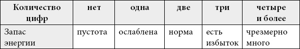 Для удобства и простоты исследования психоматрицы на предмет оценки энергии органов составим специальную таблицу, в которую мы будем записывать не наборы цифр из психоматрицы, а числа из числовой матрицы. Например, вместо двух троек 33 мы запишем 2; вместо одной цифры 2 будет вписана 1; в случае, когда цифр нет, будем записывать 0.