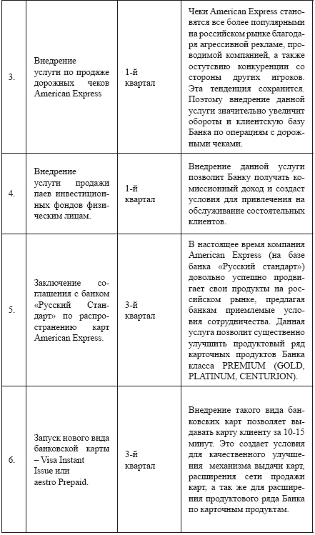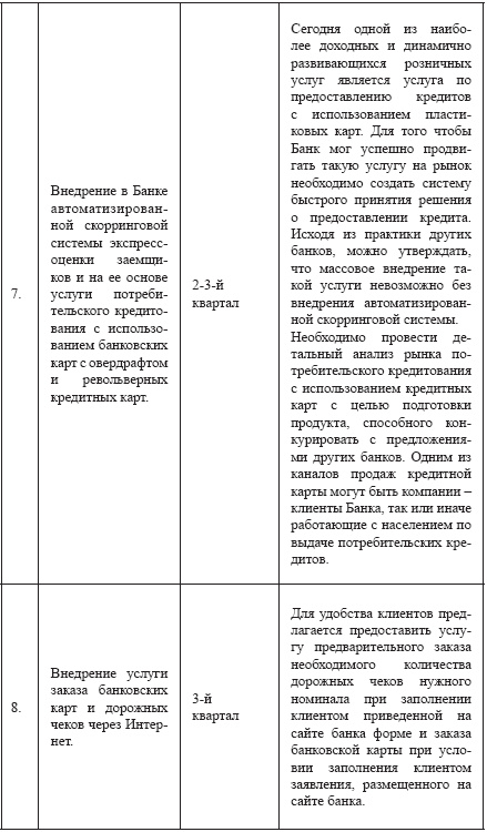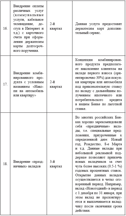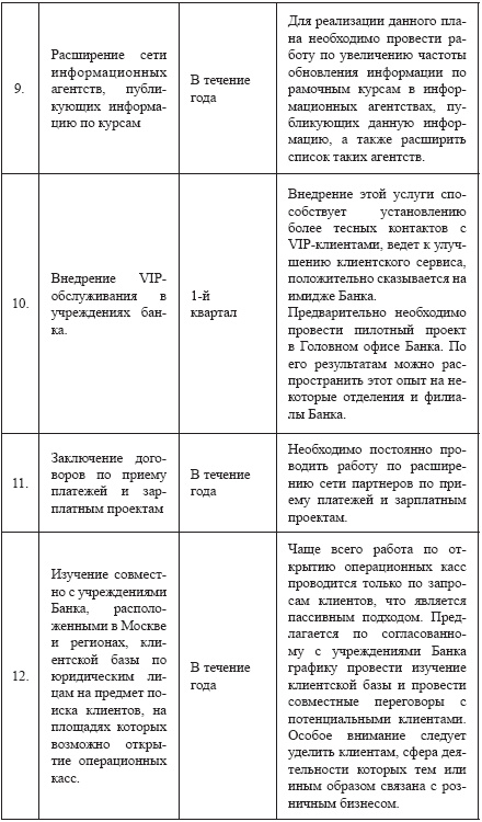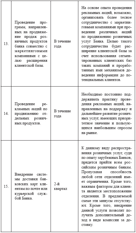 Далее приведен, в качестве примера, возможный годовой план действий небольшого российского банка, направленный на развитие розничного бизнеса: