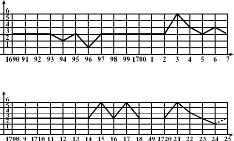 Обратим внимание на первый спад с уровня «создающий свой мир» до уровня «наводящий порядок» это 16831684 годы. После стрелецкого бунта 1682 года царица Софья, правившая вместе с Петром, искала возможность узурпировать власть, для чего ей требовалось создать для себя надежную опору (опуститься на уровень «наводящий порядок») среди высшей знати, но главное собрать стрельцов для нового бунта. В период с 1684 по 1686 год она фактически обзавелась подобной поддержкой и готова была избавиться от своего подрастающего конкурента Петра I.