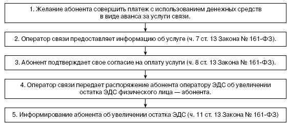 Конструкция правовых норм ч. 1 ст. 13 Закона 161-ФЗ и ч. 4 ст. 54 Закона «О связи» предполагает возможность осуществления мобильных платежей только за счет денежных средств, являющихся авансом абонента физического лица за услуги связи. Указанные положения следует рассматривать в двух аспектах. Во-первых, абоненты физические лица, использующие для расчетов метод отложенного платежа, не могут совершать мобильные платежи, что никак, однако, не связано с их платежеспособностью. Во-вторых, совершение мобильных платежей недоступно для абонентов юридических лиц, использующих для расчетов метод отложенного платежа. Этот аспект тесно связан с первой проблемой на пути развития мобильных платежей, о которой было сказано выше, недоступностью мобильных платежей для юридических лиц.