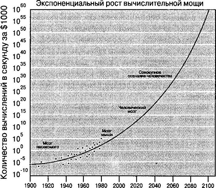 Согласно графику, мощности компьютеров стоимостью ~1000$ должны были сравняться с мощностью человеческого мозга (~1016 вычислений в секунду) в районе 2035 г. График был вычерчен около 2000 г. На суперкомпьютерах этот порог был достигнут в 2012 г. Сейчас уже очевидно, что на компьютерах за 1000$ он будет достигнут в районе 20202025 г.г.