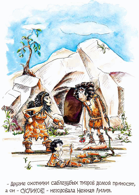 Другие охотники саблезубых тигров домой приносят, а он СУСЛИКОВ! негодовала Нежная Лилия. Седая Олениха ходит в шубе из пещерного медведя, Крикливая Брусничка хвастается мехом пятнистого леопарда, а мне опять придется шкурки сусликов оленьими жилами скреплять?