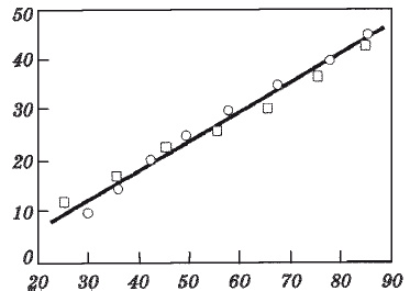 Рис. 1.6. Функция равных ощущений, соотносящая вибрацию (частота 60 Гц), подаваемую на кончик пальца с итенсивностью полосы шума. Наблюдатели подгоняли громкость так, чтобы она соответствовала вибрации (кружки) и чтобы вибрация соответствовала громкости (квадратики). Значения раздражений даны по логарифмической шкале (в децибелах). Абсцисса шум; ордината амплитуда вибрации