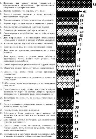 Как можно увидеть из данных, приведенных в таблице 3, учителя помещают подготовку учащихся к экзаменам на 23-е место. Однако таблица 4 показывает, что, согласно мнению педагогов (а мы скоро покажем, что они правы), ориентированная на экзамены деятельность преобладает в школьной жизни. Более того, из таблицы 5 видно, что это единственная цель. которой, как полагает большинство учителей, они добиваются довольно успешно.