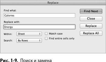 Чтобы проверить прочитанное на практике, откройте меню замены на листе «Calories». Замените слово «Калории» на слово «Энергия» везде, где оно встречается (рис. 19), вбив эти слова в окно поиска и замены и нажав «Заменить все».