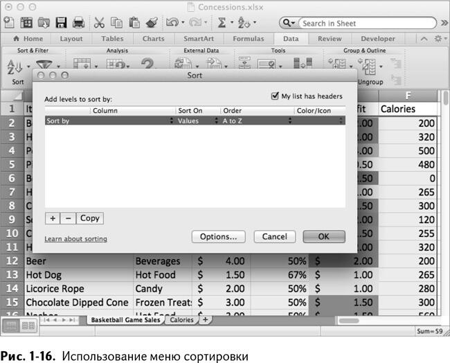 В меню сортировки, показанном на рис. 1-16, независимо от наличия заголовка у столбцов с данными, можно выбрать колонки для сортировки по названию.