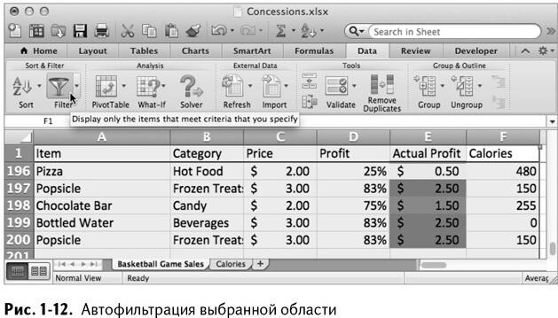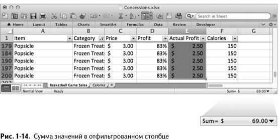 После фильтрации выделение столбцов данных позволяет нижней панели показывать краткую информацию об этих ячейках. Например, отфильтровав только замороженные продукты, можно выделить значения в столбце Е и использовать нижнюю панель, чтобы быстро узнать сумму прибыли только по этой категории товара, как на рис. 1-14.