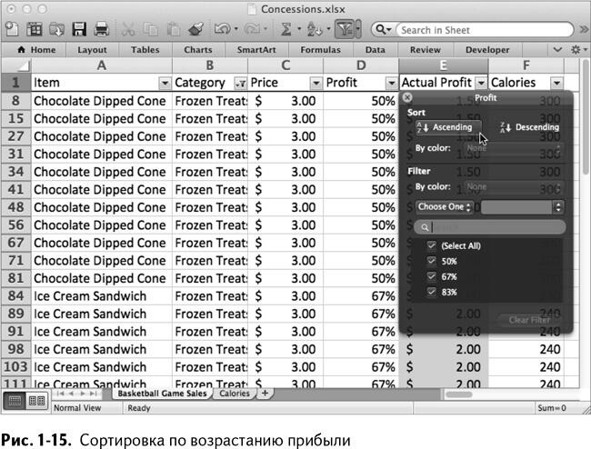 Автофильтрация позволяет также производить сортировку. К примеру, если вы хотите рассортировать прибыль, просто кликните на меню автофильтрации в ячейке Profit/Прибыль (D1) и выберите сортировку по возрастанию (или убыванию), как на рис. 1-15.