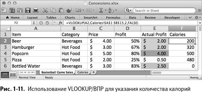 После ввода формулы вы увидите, что 200 калорий считались из таблицы в листе «Calories». Поставив $ в формуле перед ссылками на таблицу, вы можете скопировать формулу вниз по колонке двойным щелчком на нижнем правом углу ячейки. Оп-ля! У вас есть количество калорий для каждой позиции, как показано на рис. 1-11.