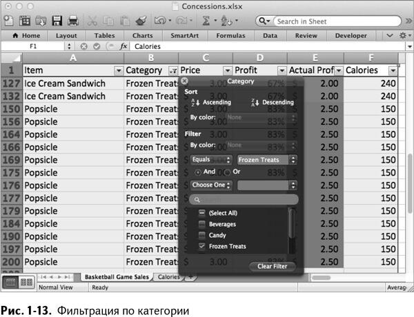 Если автофильтрация включена, можно кликнуть на выпадающем меню, которое появляется в ячейке В1, и выбрать для показа только определенные категории (в данном случае отобразятся товары из категории «Замороженные продукты»), как на рис. 1-13.