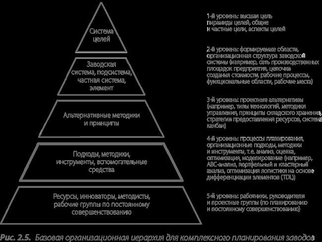 На практике производственные системы (от сети производственных площадок до отдельного завода и монтажного (сборочного) участка) реализуются в различных вариантах как в структурном отношении, так и в отношении их оперативного наполнения. Базовое строение производственной системы это пятиуровневая организационная иерархия (рис. 2.5), где: