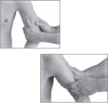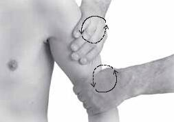 Поперечное разминание. Масссирование поперек мышечных волокон. При этом 1-е пальцы обеих кистей расположены по одну сторону массируемой области, а остальные пальцы (со 2-го по 5-й) по другую сторону. При массаже двумя руками эффективнее установить их на некотором расстоянии друг от друга (2-3 см) и затем попеременно выполнять движения 2-й и 3-й фазы разминания.
