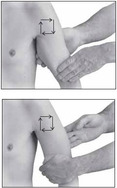 Валяние. Данный прием чаще выполняется при массаже верхних и нижних конечностей. Массажист обхватывает ладонями обеих рук массируемую поверхность и выполняет пилящие движения в противоположных направлениях с перемещением по отдельному участку тела. Валяние используют при массаже бедра, плеча, предплечья, голени (рис. 24).
