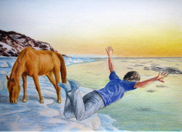 By the end of the day, my horses got tired and thirsty. I drove them down to the sea and was about to water my herds, but what in hell was that? The sea was covered with ice! I threw a large stone down, trying to break the ice, but it did not help. I pushed a heavy rock to the ice, but it did not work. I left no stone unturned but could do nothing! Then I got angry, took a run and bashed my head against the ice and it flew into pieces like glass!