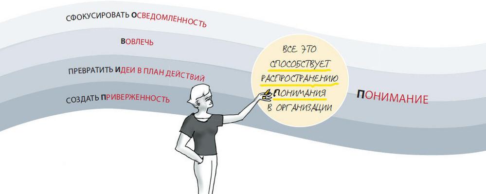 Чтобы понять, какие инструменты нужны руководителю-визуализатору, давайте разберем, с какими типичными задачами сталкивается лидер организации. Если подходить глобально, то перед вами стоят задачи сфокусировать осведомленность организации, вовлечь людей, превратить идеи в реальные планы действий и создать приверженность в отношении проектов и инициатив. На следующей странице приведена простая модель задач лидера, представляющая собой импровизацию на тему четырех потоков. Следовательно, семь ключевых инструментов это те, которые позволяют достичь указанных целей.