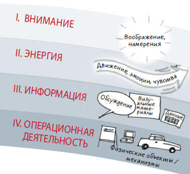 Четыре потокаМодель четырех потоков ключевой инструмент фасилитаторов, который имеет отношение к лидерству. Возможно, вы обратили внимание на четыре полосы разных оттенков синего цвета, проходящие через заглавные страницы всех книг этой серии. Это графическое изображение четырех способов человеческого восприятия и осмысления вещей. Обычно мы говорим о духе, душе, уме и теле. Карл Юнг определял их как интуицию, чувства, мысли и ощущения. Мы называем их потоком внимания, потоком энергии, потоком информации и потоком операционной деятельности. Цель лидеров и менеджеров научиться управлять этими потоками по отдельности и вместе.