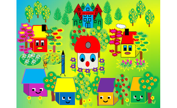 Смотри, к зданию двигаются геометрические фи-гуры.
