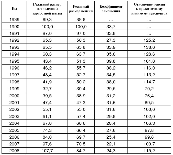 После глубокого падения в 1999 г., когда средний размер пенсии снизился до критической черты и составлял всего 70 % прожиточного минимума пенсионера (ПМП), к 2002 г. средний размер пенсии удалось сравнять с ПМП. Несмотря на то что рост покупательной способности пенсий продолжился и после начала пенсионной реформы, его темпы замедлились. В результате даже спустя девять лет после 1998 г. это соотношение так и не вернулось к докризисному уровню.