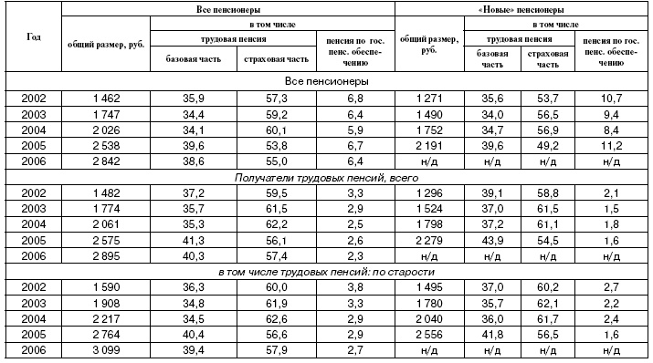 Источники: Форма 94-Собес. Обобщение государственной статистической отчетности в области пенсионного обеспечения за 2002 год // Пенсия. 2003. 11; Сведения о численности пенсионеров и суммах назначенных им пенсий по Российской Федерации по состоянию на 31 декабря 2003 г. / Пенсия. 2004. 7; Сведения о численности пенсионеров и суммах назначенных им пенсий по Российской Федерации по состоянию на 31 декабря 2004 г. // Пенсия. 2005. 7; Отчет о численности пенсионеров и суммах назначенных им пенсий по Российской Федерации по состоянию на 31 декабря 2005 г. // Пенсия. 2006. 94; Итоги деятельности ПФР за 2006 год // Вестник Пенсионного фонда России. 2007. 1.
