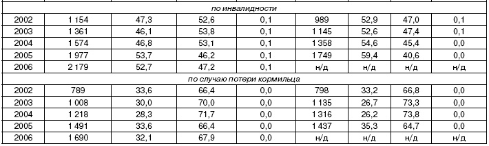 Увеличение доли страховой части пенсии в средних размерах назначенных в отчетном году пенсий было менее выраженным, особенно для пенсионеров по старости и инвалидности, что отражает тот факт, что пенсионные права новых пенсионеров 20022004 гг. сформировались в рамках прежней системы и учитывались с ограничением на соотношение индивидуального и среднего по стране заработков. Это также подтверждает то обстоятельство, что относительное увеличение страховой части пенсии для всех пенсионеров происходило исключительно за счет разных темпов индексации. Тем не менее в три первых года реформы пенсионной системе удалось придать импульс для перехода на страховые принципы, когда большая часть пенсионных выплат зависит от реального трудового вклада пенсионера в течение трудовой жизни.