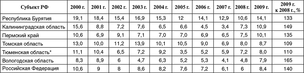 Рост зарегистрированной безработицы произошел далеко не во всех регионах с сильным спадом промышленности. Такое несоответствие объясняется в первую очередь административным сдерживанием роста зарегистрированной безработицы. В результате этот показатель малопригоден для анализа влияния кризиса на региональные рынки труда. В пилотных регионах максимальный показатель зарегистрированной безработицы на конец 2009 г. имела Вологодская область (табл. 1.5). Это обусловлено высвобождением большого числа занятых в Череповце (около 15 тыс. человек) компаниями «Северсталь» и «Азот», а также выделением значительных федеральных средств на поддержку занятости, что создавало определенные стимулы к предоставлению данного статуса. Не создавались барьеры для регистрации безработных и в Пермском крае. В целом в четырех из шести пилотных регионов показатели зарегистрированной безработицы были выше средних по стране. В Бурятии ситуация иная, большинство безработных не обращаются в службу занятости, поэтому уровень зарегистрированной безработицы искусственно занижен он почти в 6 раз меньше показателя безработицы по МОТ, в то время как в среднем по стране и в большинстве регионов в 3 раза. Что касается Тюменской области, то в ней докризисный уровень зарегистрированной безработицы был низким и, несмотря на рост безработицы, измеряемой по методологии МОТ, в 2009 г. не изменился.
