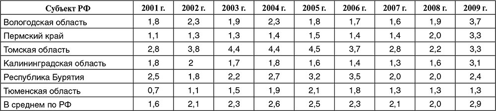 До кризиса проблема безработицы в пилотных регионах была второстепенной. Вологодская, Калининградская и Тюменская области имели минимальный уровень безработицы по методологии МОТ (57 %), Томской области удалось снизить этот показатель к 2007 г. (табл. 1.4). Только в Бурятии он оставался повышенным из-за острого дефицита инвестиций и новых рабочих мест. Кризис изменил ситуацию, но не радикально, если оценивать проблему по статистике открытой безработицы. Показатели безработицы, измеряемой по методологии МОТ, наиболее высоки в регионах с исходно худшим состоянием рынка труда (Бурятия) и в регионах с более сильным промышленным спадом (Калининградская область и Пермский край). В Вологодской области безработица выросла сильнее всего, но остается относительно невысокой, несмотря на сильный спад промышленности. Это следствие локализации кризисного очага в Череповце и принятых мер по поддержке занятости (см. ниже).