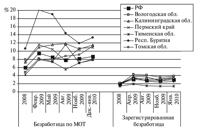 Колебания безработицы имеют сезонный характер в целом по стране и в пилотных регионах. Максимальный рост зарегистрированной и общей безработицы произошел в первом квартале 2009 г., летом отмечалось сезонное снижение, а в декабре 2009 и январе 2010 г. ситуация на рынке труда вновь заметно ухудшилась (рис. 1.2). Репрезентативность помесячных измерений безработицы по МОТ в регионах относительна, но по совокупности двух индикаторов (общей и зарегистрированной безработицы) пилотные регионы можно разделить на три группы: с резким обострением проблем в кризисный период (Вологодская, Калининградская области и Пермский край), застойно проблемные (Бурятия, Томская область) и пока не испытавшие сильных проблем на рынке труда (Тюменская область).